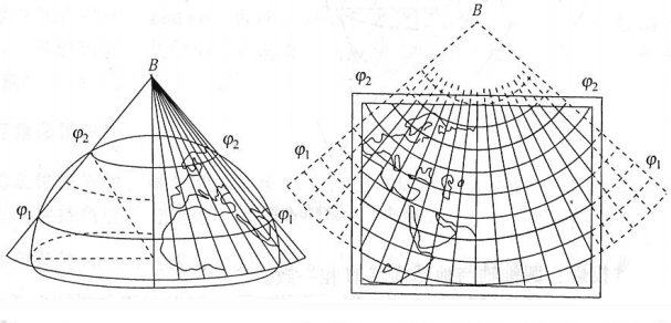 - 圆锥投影通常基于两条标准纬线,从而使其成为割投影,超过标准纬线的纬度间距将增加